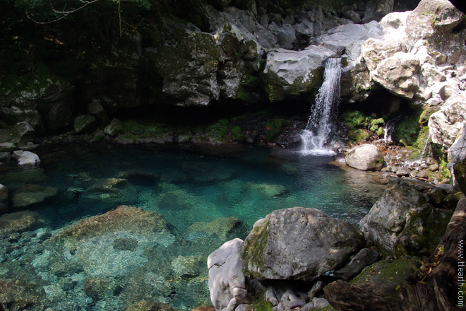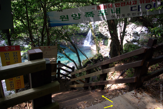 아래로 내려 가면 계곡으로 가고, 오른쪽으로 가면 원앙 폭포로 간다.