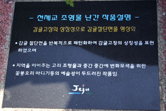 중문 천제교 난간. 감귤의 절단면을 표현한 것이다. 감귤 사이의 세 개의 구멍이 뚫린 기둥은 정주석(정주목)을 차용한 것이라 생각된다.
