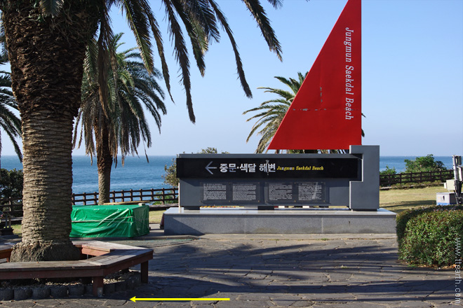 중문 해변은 기반 시설이 잘 갖추어진 제주에서 유명한 해수욕장이다. 안내판에는 모래밭 길이 560m, 폭 70m라고 쓰여있다. 해수욕장은 7~8월에 개장한다.