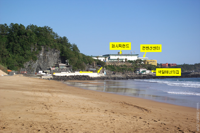 모래밭에서 서쪽으로 본 모습. 내려오는 길이 보이고, 사진 오른쪽에 색달 해녀의 집이 있다.