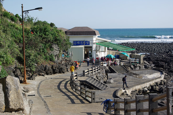 색달 해녀의 집. 제주도의 수많은 해녀의 집들과 마찬가지로, 전복죽과 해삼, 멍게, 소라 등 해산물을 판다.