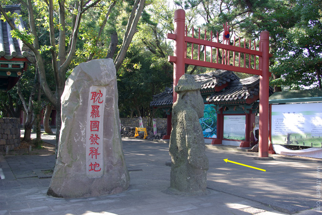 입구 홍살문 양쪽에 돌하르방이 있다.