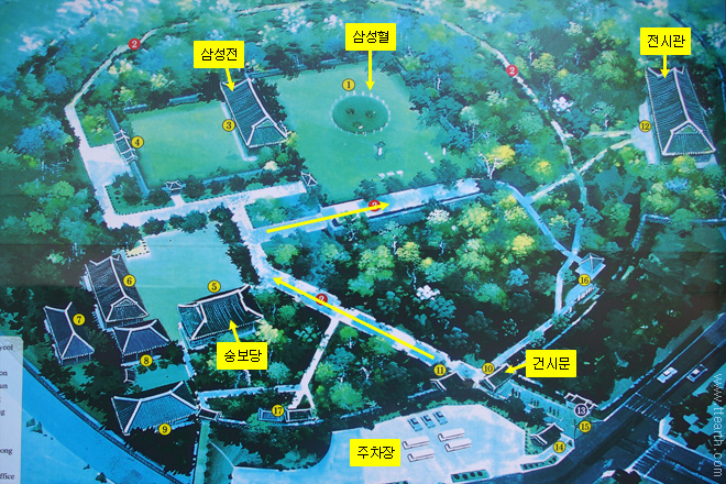 삼성혈 조감도. 똑바로 가면 삼성전이 있고, 삼성전 뒤에 삼성혈이 있다.