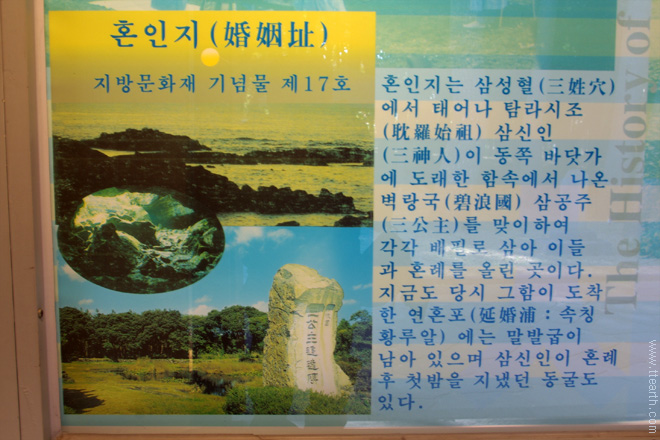 혼인지 설명. 세 성인이 벽랑국 공주들을 맞이하여 혼례를 올린 곳이다. 혼인지는 성산읍 온평리에 있다.
