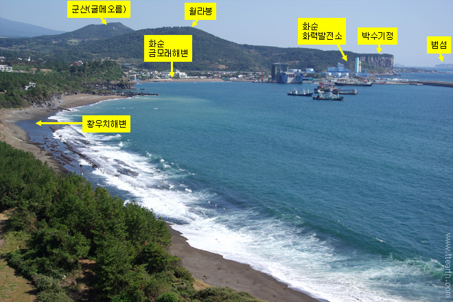 동쪽(왼쪽)으로 멀리 대평리(난드르)의 박수기정이 보인다. 박수기정은 박수물이 솟는 절벽이란 의미이다. 높이 130m. 박수는 바가지로 마시는 샘물, 기정은 절벽, 높은 벼랑이다.