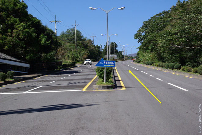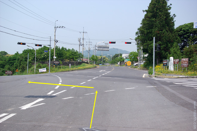 중문에서 갈 때에는 서귀포 서부 도서관 앞의 중문 초등학교 입구 사거리에서 북쪽으로 제주 국제대 사거리로 간다.
