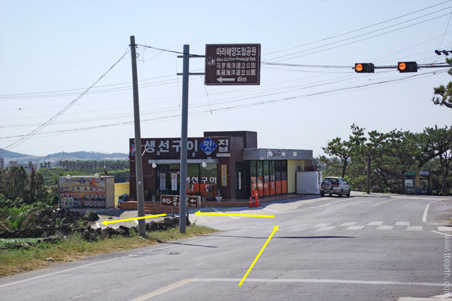 산방산에서 서쪽으로 보면 삼거리가 있다. 형제 해안로는 산방산에서 송악산으로 가는 길을 말한다. 표지판의 송악산 쪽으로 간다.