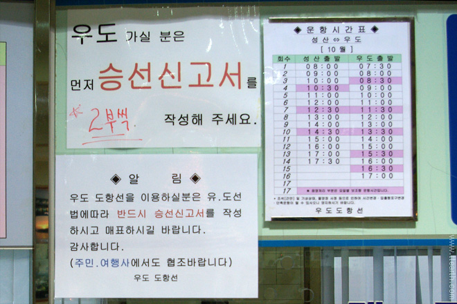 우도로 가는 배 시간은 성수기, 비수기, 여름, 겨울에 따라 다르고 월별로도 다르다. 따라서 위 시간은 참조용으로 생각할 것. 여름 성수기나 주말 등에는 시간표에 제시된 출발 시간 사이에도 배가 수시로 있기 때문에 사실 시간에는 신경쓰지 않아도 된다.