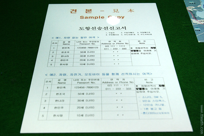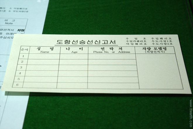 승선 신고서 견본. 이름과 나이, 연락처를 적으면 된다.