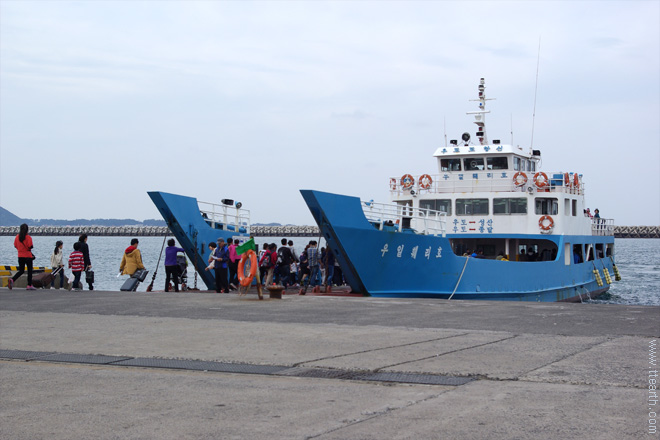 파란색 배(우일호, 우일 훼리, 우일 카훼리, 덕일 훼리 : 우도 해운)와 흰색 배(우도 랜드 1호, 우도 랜드 2호 : 우도 랜드)는 우도 천진항으로 가는 배이다.