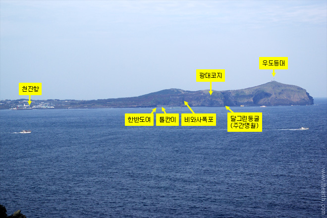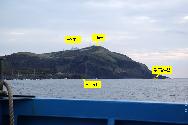천진항으로 가는 도중에서 본 우도봉과 우도 등대.