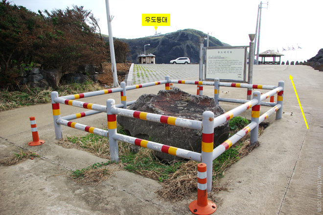 우도 등대가 보이고 우도 지석묘가 있다. 뒷편은 한반도여 주차장이다.