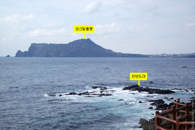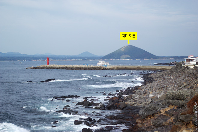 바다 건너 식산봉이 보인다. 성산 일출봉에서 오조 한도교를 지나면 서쪽에 있는 작은 봉우리이다.