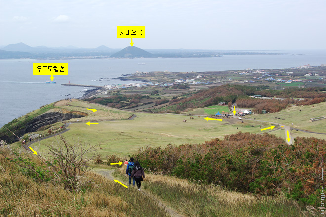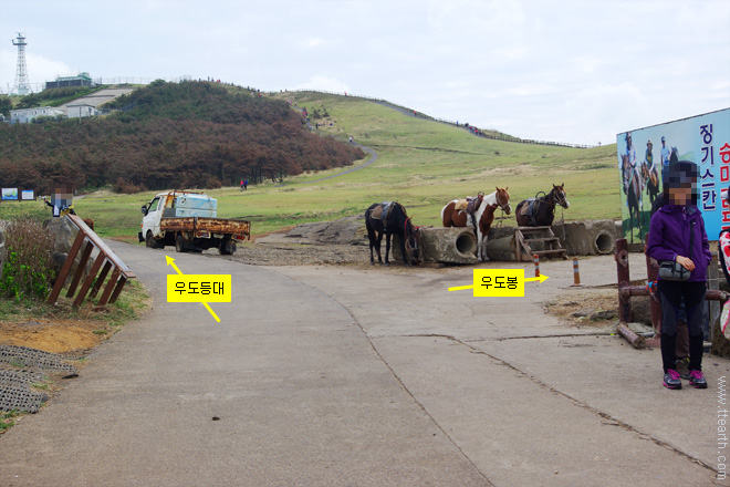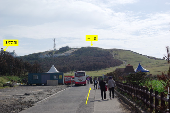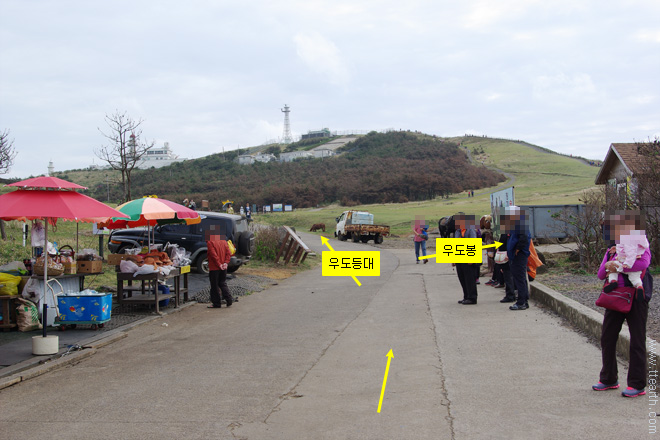 길이 정해져 있는 것은 아니지만, 일반적으로 오른쪽으로 가서 우도봉으로 올라간다. 똑바로 가면 우도 등대로 간다.