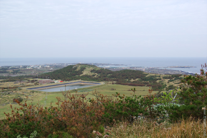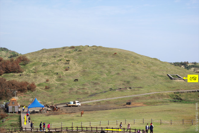 정상에서 내려다 본 모습. 우도봉(쇠머리 오름) 굼부리이다. '굼부리'는 분화구의 제주말이다.