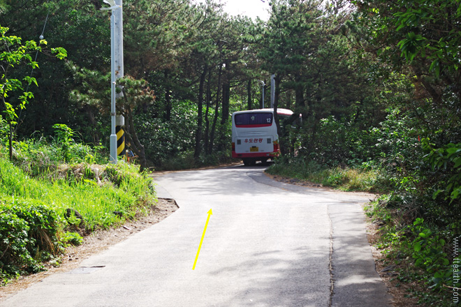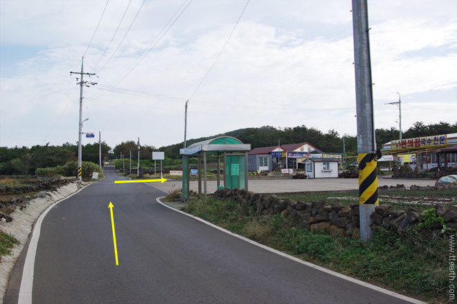계속 가면 마을 버스 정류장이 있고, 편의점들 앞에 주차장이 있다. 오른쪽으로 간다. 검멀레로 바로 가려면 직진한다.